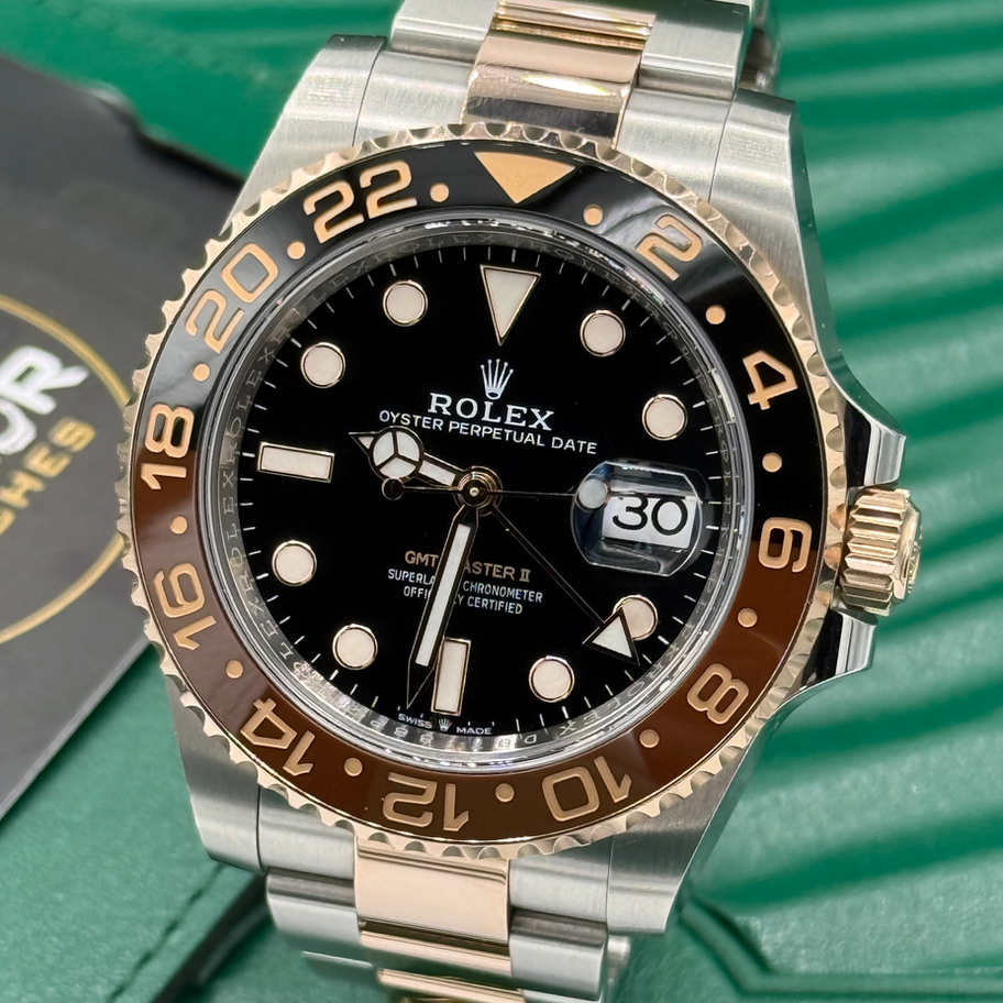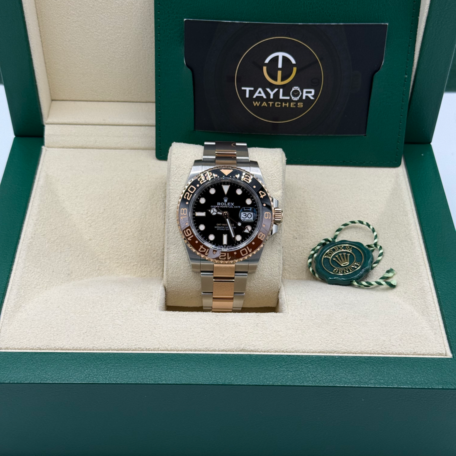 Here we have for sale a Rolex GMT Master II 'Root Beer' 40mm in 18k rose gold & stainless steel featuring a black dial on an oyster bracelet. The watch is in good condition and accompanied by box and papers dated 2021.